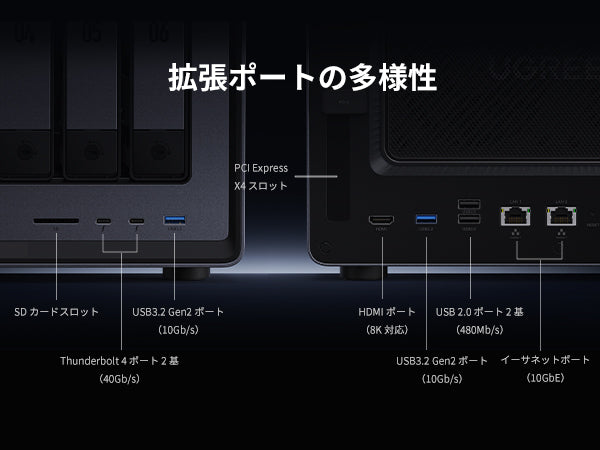 8つのSATAドライブベイと2つのM.2 NVMeドライブベイを備えたNASync DXP8800 Plusは、最大256TBのストレージ容量を備えています。また、JBOD/Basic/RAID0/RAID1/RAID5/RAID6/RAID10のRAIDパターンをサポートしています。